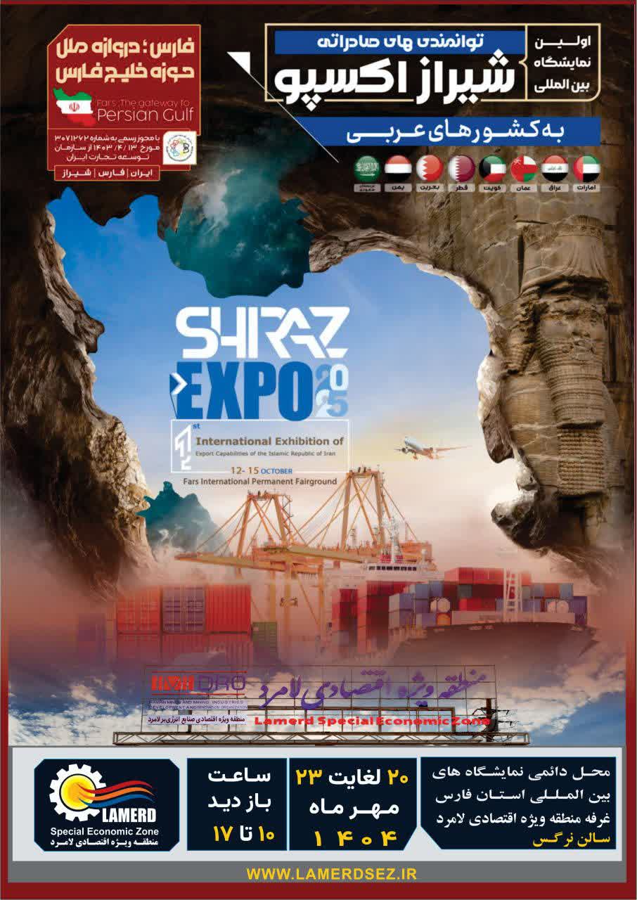 اطلاعیه/ #شیراز_اکسپو_۲۰۲۵ فرصتیست برای معرفی توانمندیهای تولیدی، صادراتی و سرمایهگذاری استان فارس به کشورهای حوزه خلیجفارس و شرکای تجاری ✨ 🔰حضور منطقه ویژه اقتصادی لامرد در شیراز اکسپو ٢٠٢۵